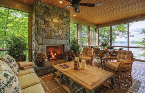 Thanks to its gas fireplace (top), the screened porch is a favorite place to relax almost year-round.