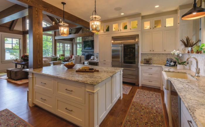 Above: In the living room, oak beams and a massive stone fireplace pay homage to traditional New Hampshire lake house design, while oversized windows frame a spectacular view of Lake Sunapee. Top: In a house where entertaining was part of the plan, the kitchen is the center of all the action. It was designed as a living space with a look and traffic flow that worked seamlessly with the dining and living areas on the home’s main level.