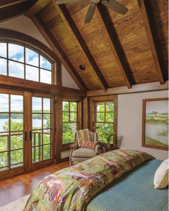Similarly, the interiors of the two homes are compatible but not duplicates. Margaret felt the original home was a bit dark, and wanted the new house to feel lighter and airier. It was designed with higher ceilings, more glass and a more open floor plan. Bonfiglio calls the building style “faux timber frame.” Although it was not constructed using timber-frame techniques, it sports the beams and open spaces of a traditional timberframe house.