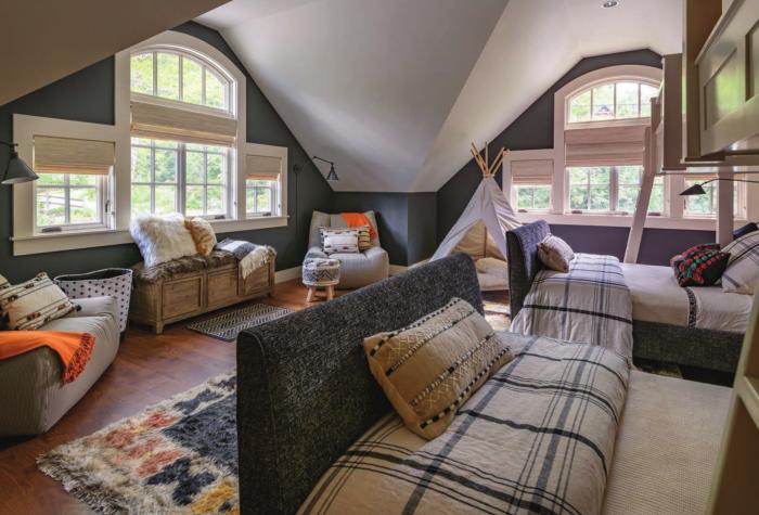 Patten first met Margaret and Jerry when they called upon her to create and furnish the interiors of their first Lake Sunapee home. Patten knew the couple treasured time with family and friends, but she wanted to be sure the new home also served as a hideaway with personal spaces just for them. Patten credits White for designing and McGray & Nichols for building “a wonderful, magical space that enabled me to create fabulous microenvironments.” Nooks and crannies are tucked throughout the home, creating private getaways even while the house easily accommodates a crowd.