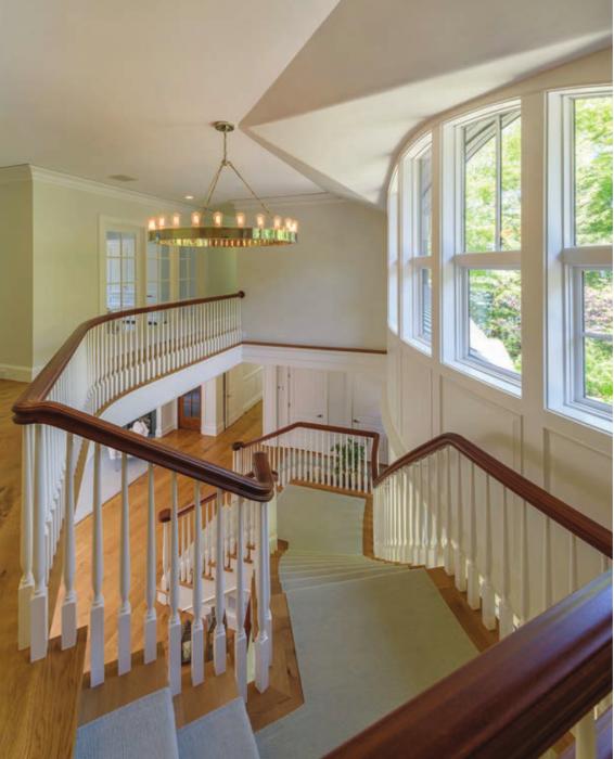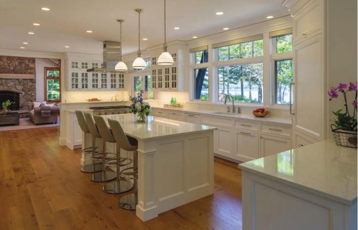 There was already a house on the property, but the space didn’t provide the functionality the couple wanted in terms of space, views and natural light. The couple decided to replace the building with a home designed by Jeremy Bonin, of Bonin Architects in New London. The resulting ten-thousand-plus-square-foot structure, located on 2.2 acres, is an outstanding example of a home with a lake-vernacular exterior and an updated interior. Just some of the many amenities are a library, spa, sauna, cigar room, gym, rec room and bunkroom for the grandkids. The house—which is situated so its inhabitants can enjoy both morning sunlight and sunsets over the lake— is full of windows and boasts numerous lake views. In fact, a large part of it is nearly “see-through”— you can look through windows in the front and see the lake behind the house through the back windows.