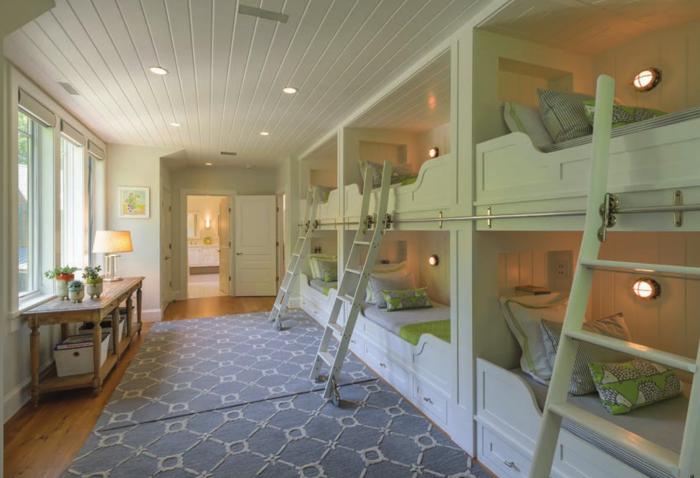 The rec room flooring consists of interlocking carpet squares, so individual pieces can be removed and replaced in case of spills or stains. The bunkroom is one of the most charming rooms in the house. Each sleeping cubby has its own light and USB port. Sturdy rolling ladders to the top bunks and builtin storage under each set of beds help keep the room ship shape. Gray-blue, white and green fabrics—including a cheerful, graphical hedgehog print selected by the homeowners—convey a sense of fun and playfulness.