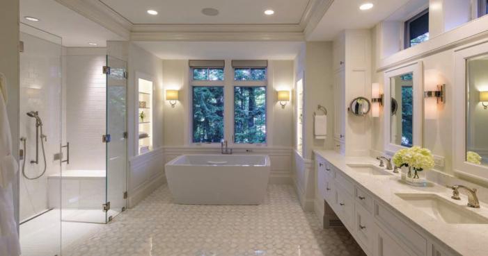 To ensure privacy, the master bedroom area can be completely closed off from the rest of the house as needed. The bedroom has built-in closets and window seats. Pocket doors separate a large dressing room and the master bathroom. The master bathroom is appointed in soft white, with white painted cabinets, a glossy white-andgray hexagonal marble tile floor, a walk-in shower and a soaking tub. Windows at tub level allow the bather to look out at the lake and the trees, but due to the siting of the house, the room is located high enough to be private.