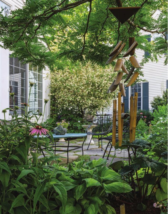“The design I developed for them was a kind of Stage 1. As they gained confidence, they took on more and more garden,” Hayward says. “And then there is Sally’s love of flowering perennials. That is where the color came from.” All the gardens are filled with colorful foliage and flowers. Sally pays close attention to textural contrasts and has layers of plants so there is always something in bloom, including climbing ‘New Dawn’ roses, pink anemones, tall black cohosh, coneflowers, daylilies and lots of peonies, to name just a few. A mini wisteria climbs up an iron trellis and shrubs—including potentilla, azaleas and a Korean lilac—are planted around the perimeter to add a touch of privacy. “In-town like this, you want to do everything you can to be enclosed and protected,” Sally says. “I often use small trees instead of shrubs and planted a small maple next to the steps.”