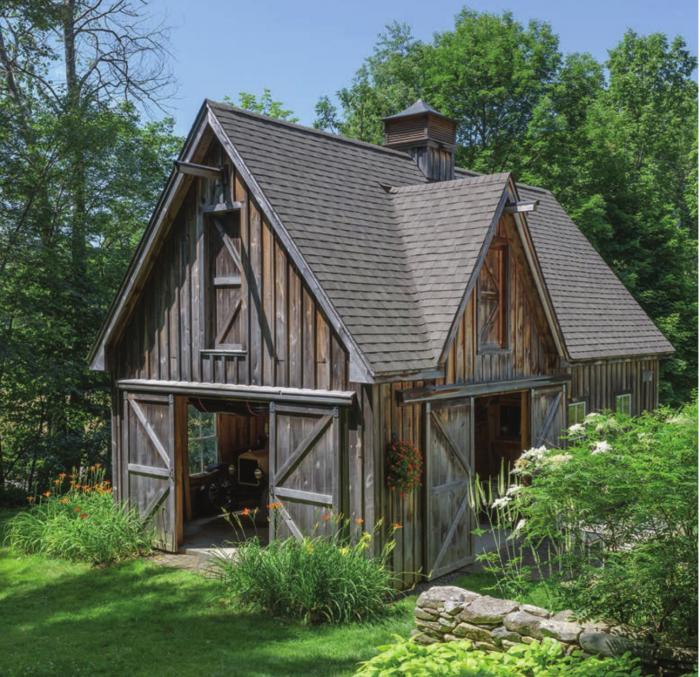Bruce designed the barn—built from locally milled hemlock—to house his lovingly restored 1917 Model T Ford. “The roof pitch is rather steep on purpose,” Bruce says. “I had to add the cupola because neighbors were thinking it was to be a chapel!” Located at the bottom of the slope, the barn was built on the site of their old vegetable garden. “I’ve really missed that garden ever since,” Sally says, “but we find places to plug in vegetables.” She has kale and lettuce growing in window boxes, and other vegetables and herbs in pots on the patios.