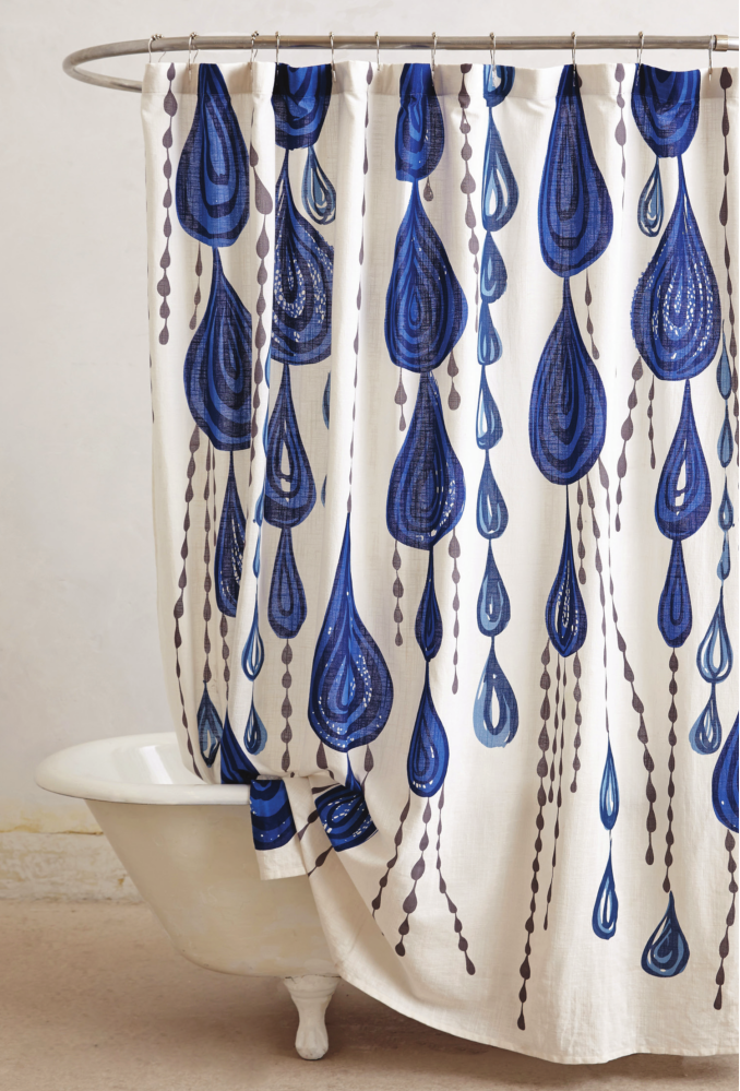 The Jardin Des Plantes shower curtain has a whimsical design thanks to the water drop motif by South African artist Ruan Hoffmann.