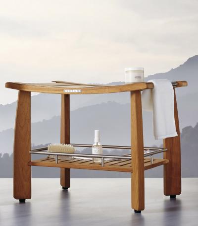 This solid teak shower bench with shelf and stainless steel wire basket provides comfort and convenience.