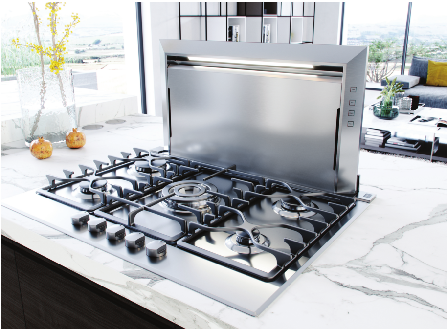 Zephyr’s space-efficient integrated downdraft range hood elevates with the touch of a button to an 18-inch rise, ensuring all smoke, grease and odors are eliminated. Ferguson Bath, Kitchen & Lighting Gallery • fergusonshowrooms.com