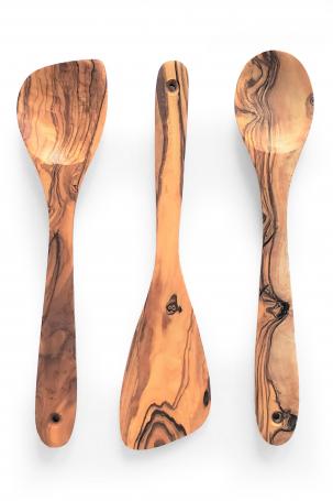 A handsome olive wood three-piece set ideal for farmhouse kitchens and midcentury décors.
