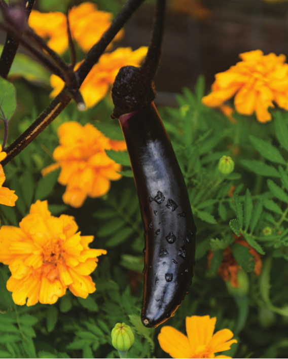 Shiso and “Bull’s Blood” beets offer colorful edible leaves, while nasturtiums and red zinnias intermingle with fragrant herbs, such as dill, rosemary and basil.