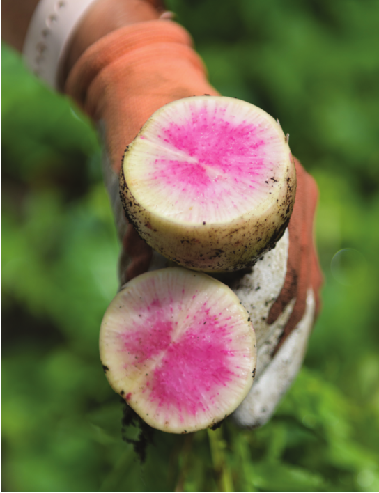 Shonk likes trying different things such as golden beets instead of red ones, watermelon radishes that are pink inside and slender Asian eggplants, all pictured here clockwise from top.