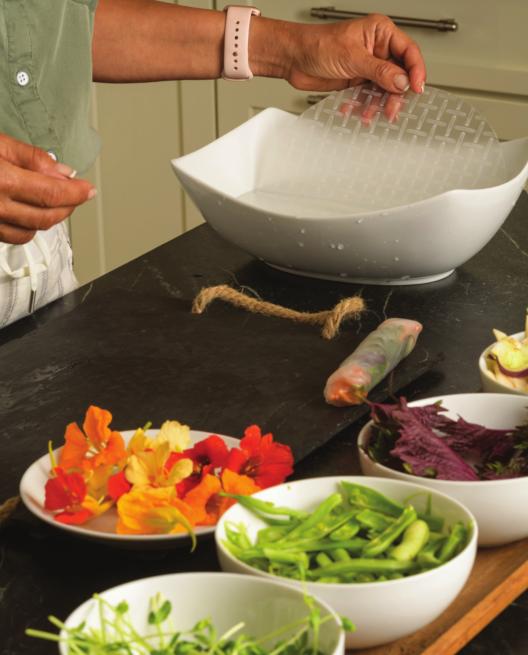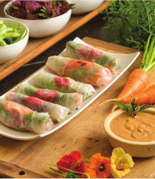 1. Using hot water, soften rice wraps just enough to make them pliable and fill them with julienne-sliced, raw vegetables, such as beans and peppers.