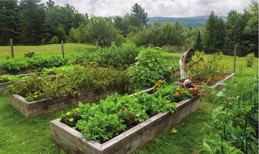 Susan and Trowbridge designed a fenced-in area with ten raised beds for vegetables near a shed that provides running water and storage for tools and supplies.