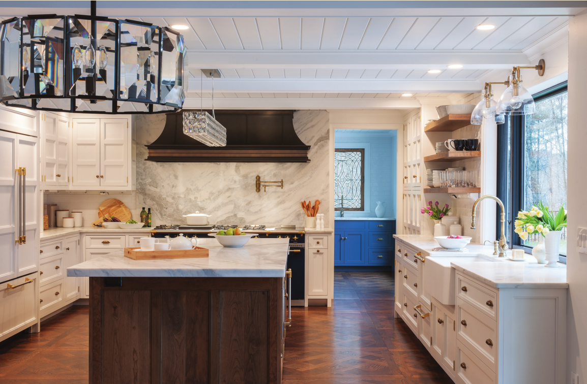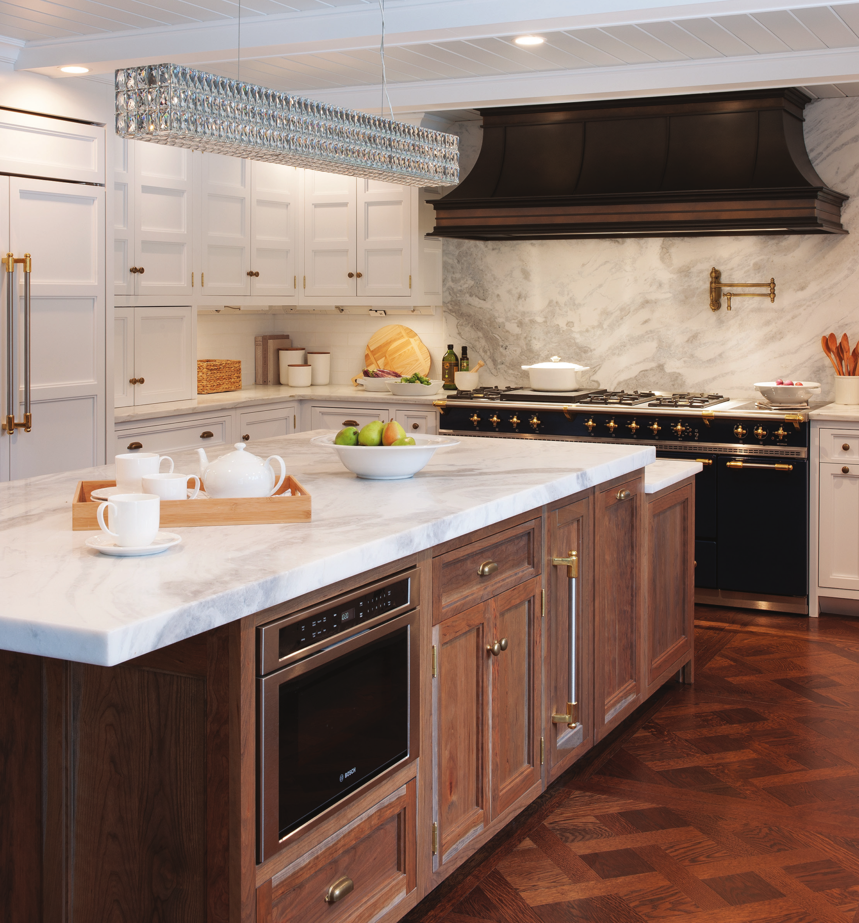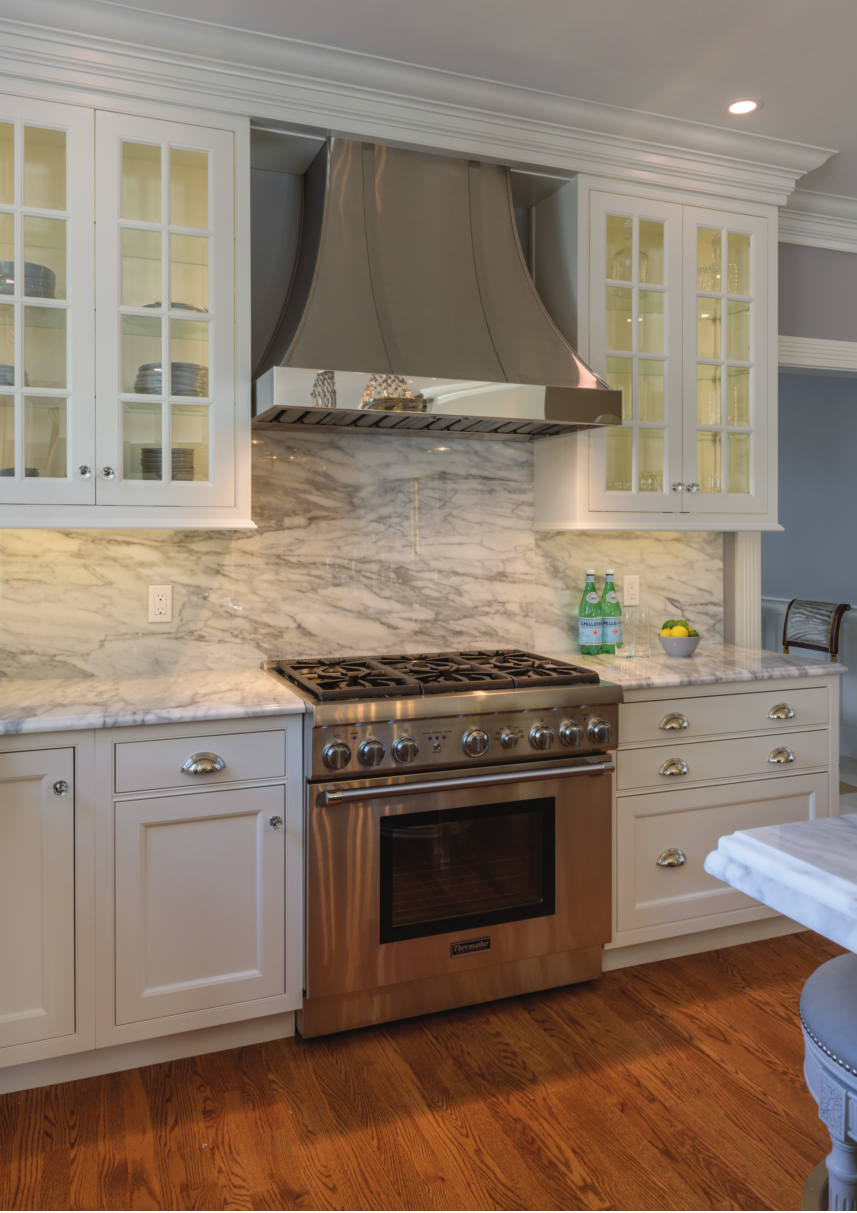 Kitchen perimeter and butler’s pantry counters, Calacatta Retro marble with a honed finish; kitchen island and wall behind range, Namib Fantasy marble with a leathered finish, both installed by Ripano Stoneworks (603) 886-6655 • ripano.com