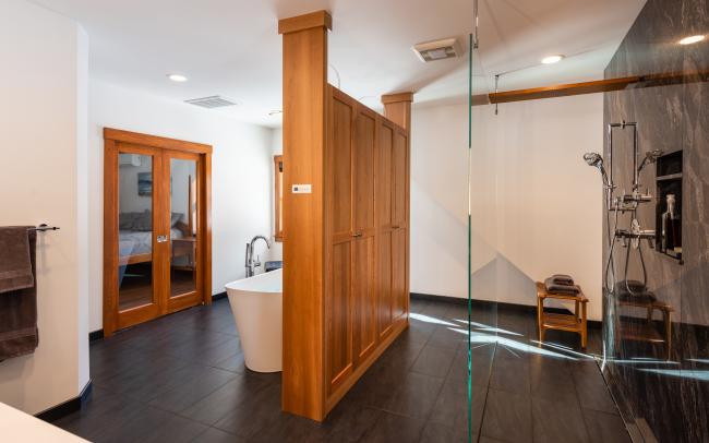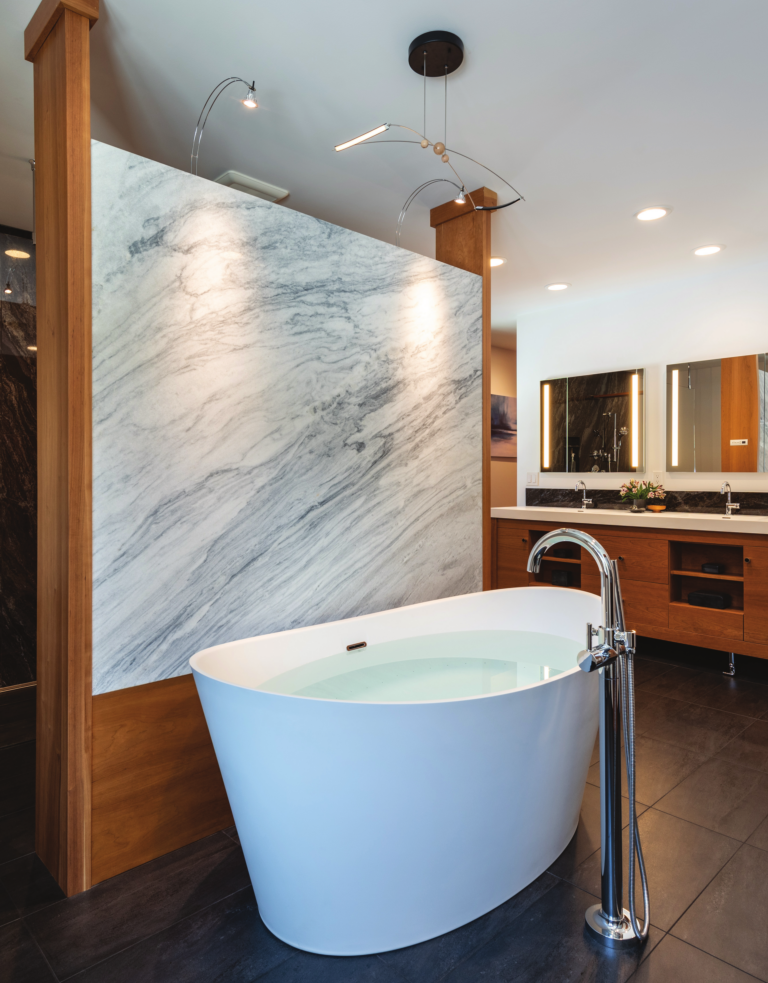 Double pocket doors lead into the bathroom from the master bedroom. At the front of the space is an air-jetted bathtub, set against a dramatic Mont Blanc marble and natural cherry wood wall. The wall hides a large, walkin shower that’s open on two sides.