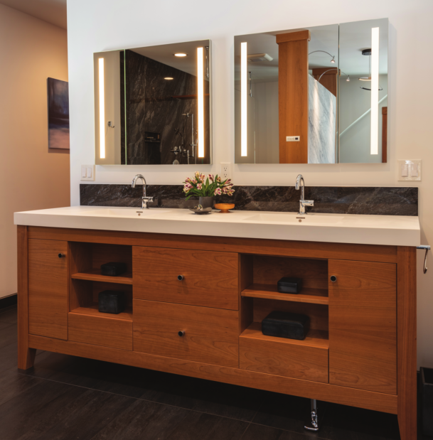 A sleek, custom-designed cherry vanity has two sinks, each centered under lighted medicine cabinets. The counters are constructed of easy-toclean engineered stone. Designed with double drawers and removable shelves to access the plumbing underneath, the vanity offers plenty of storage space. A foot pedal on the right side of the sink enables users to turn on the water hands-free. Charging stations and electrical outlets inside the cabinets offer added convenience. A lavatory adjacent to the vanity is accessed through a swing door, offering additional privacy.