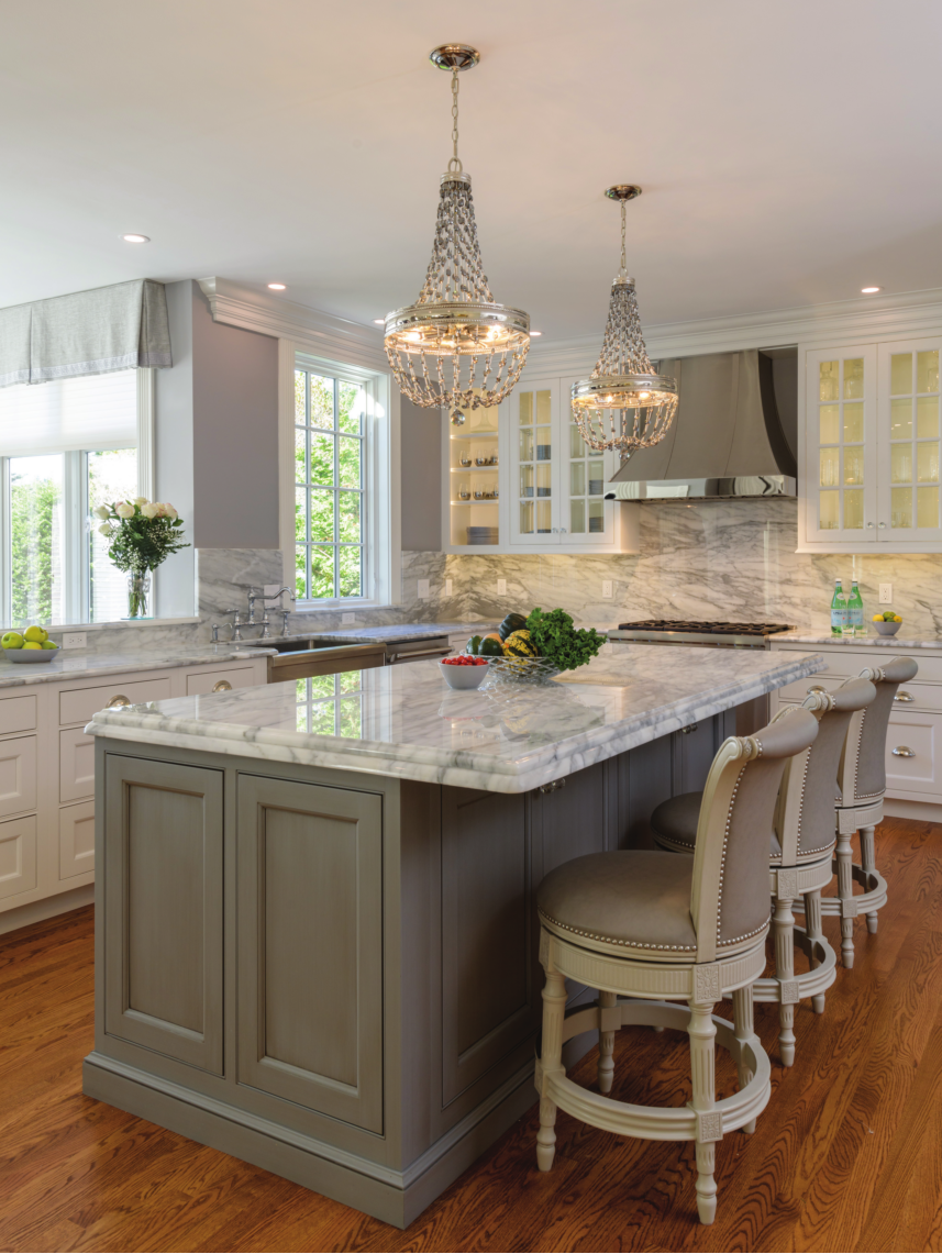 The kitchen is inviting and elegant, featuring gray walls, marble countertops and a marble-topped gray island that is the room’s sculptural centerpiece. “[The homeowner] loves to cook,” Cloutier says. “She wanted to open up the kitchen and make it user-friendly. Now, it fits [her] personality: full of light, bling and sparkle.”