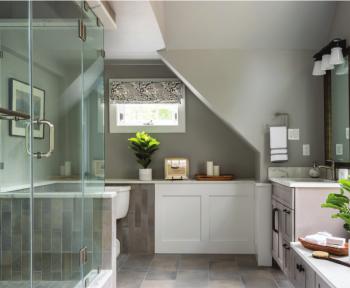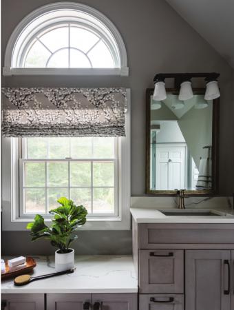 Clark established a monochromatic color palette of gray, taupe and blue-gray that ties together the fixtures, tile and custom cabinets. She also played off a Palladian window that provides most of the natural lighting in the space. A balance of materials—wood, metal, stone and glass—as well as organic plants help bring the outside in.