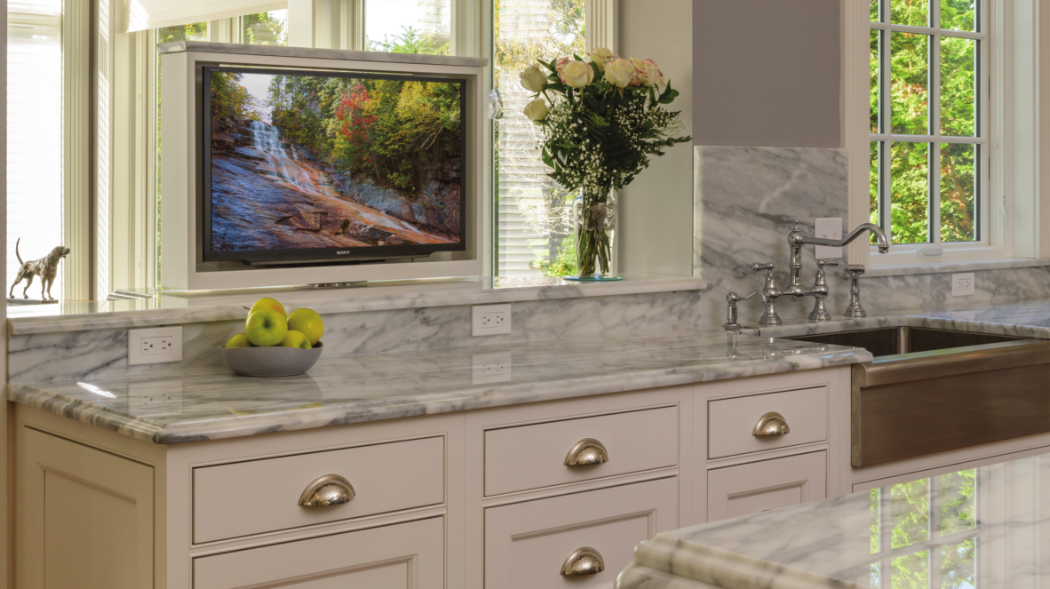 Another unique feature: A TV, topped by a piece of marble that matches the counter, recesses into the half wall separating the kitchen and breakfast area. Once raised, it can be turned around to face viewers in either room.