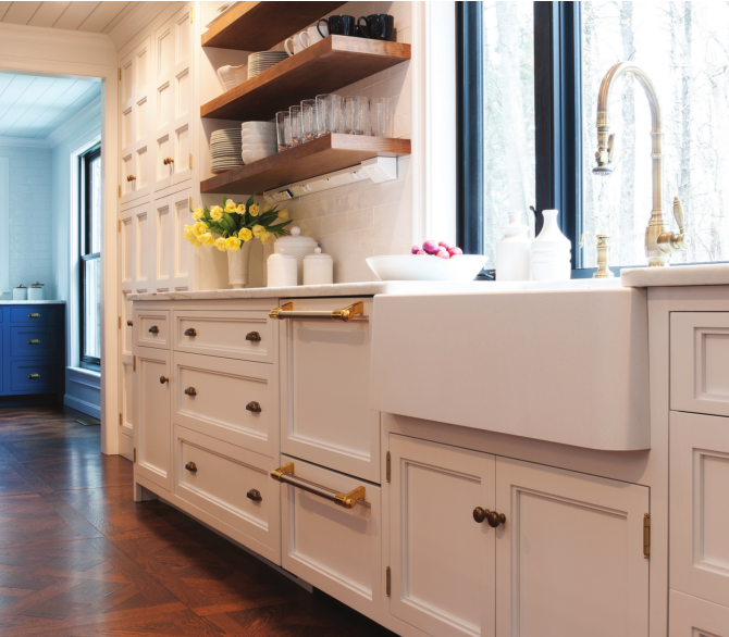 Just off the kitchen, the cheerful pantry is a bright indigo blue (also inspired by the range). The space not only features storage, but also a coffee maker built into a wall of cabinets, a beverage refrigerator and a toaster oven. Cherry floating shelves tie in with similar shelving in the kitchen. At the far end of the space is a leaded glass window that Collins discovered at Nor’East Architectural Salvage in South Hampton. The floors were inspired by a visit to New York City’s Tavern on the Green restaurant. They are white oak parquet in a Versailles pattern, stained to match other floors in the house.