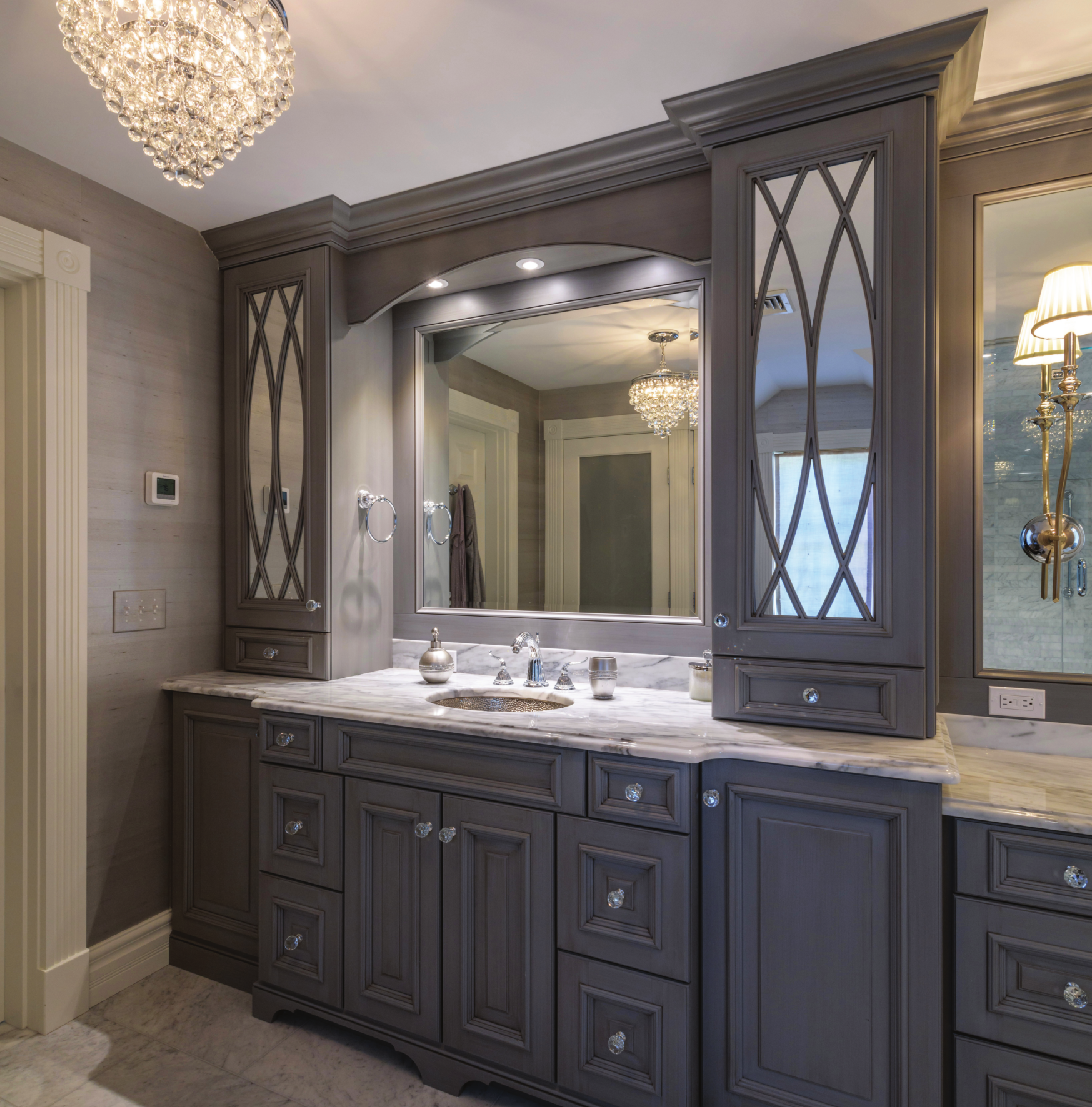 The master bathroom, with his and hers spaces, also reflects the homeowner’s sense of fun and glamour. The “hers” side of the bathroom is highlighted by a spectacular gray, marble-topped vanity with an elegant mirrored cabinet. Two crystal chandeliers and hammered silver sinks add bling. Opposite is a large, marble-tiled shower. The honed marble floors have radiant heat, and there’s also a towel warmer. “I keep the bathroom warm because I hate to be cold,” says the homeowner. Past the shower is the “his” bathroom. Also designed in shades of gray, the space features a large, marble-sided bathtub and a marbletopped vanity.