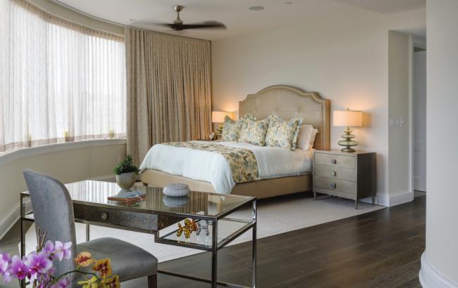 The master bedroom has a long, curved wall. The feel is like an embrace. Designing and furnishing for a curved wall is exacting. When Callihan surveys the room, he says that what makes this space work are the custom furnishings: the rug, ottoman, desk and layered drapes.