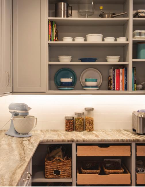 She also does all her baking prep in the pantry, now that it is equipped with deep counters for her appliances and plenty of storage, as well as a window for natural light and a feeling of spaciousness.
