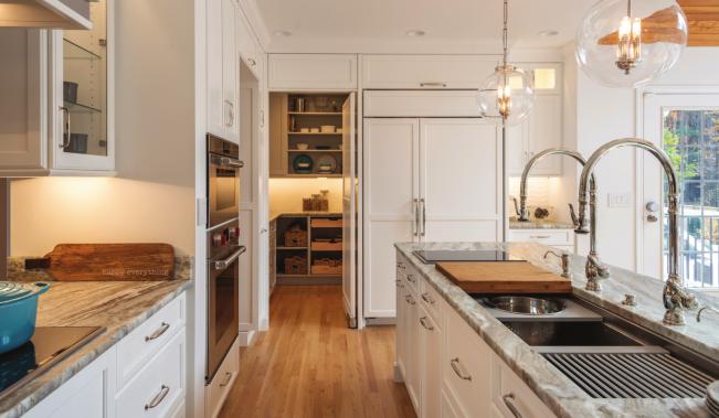 Nickerson and Hall understood Tanya and George’s vision of maintaining an open design—and they also understood the challenges. “Space was very narrow,” Nickerson says. Tanya knew she had to give up some of the space in the pantry due to backing the refrigerator into it. Hall suggested removing the framed wall between the kitchen and the pantry, and replacing it with furniture-grade board and cabinetry around and behind the refrigerator inside the pantry. “His solution not only opened up the narrowness of the pantry area but also added a large amount of visible storage space,” George says.