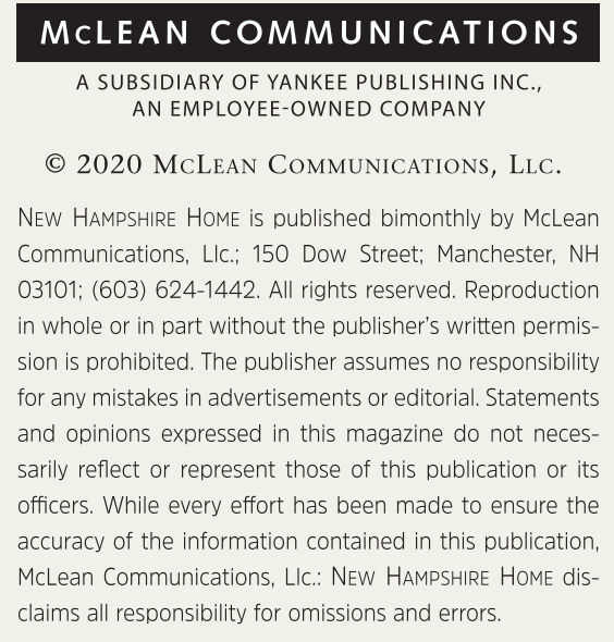 New Hampshire Home is published bimonthly by McLean Communications, Llc.; 150 Dow Street; Manchester, NH 03101; (603) 624-1442. All rights reserved. Reproduction in whole or in part without the publisher’s written permission is prohibited. The publisher assumes no responsibility for any mistakes in advertisements or editorial. Statements and opinions expressed in this magazine do not necessarily reflect or represent those of this publication or its officers. While every effort has been made to ensure the accuracy of the information contained in this publication, McLean Communications, Llc.: New Hampshire Home disclaims all responsibility for omissions and errors.
