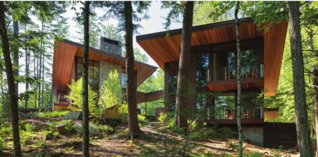 This occurs especially at pivot points where geometries of adjacent buildings are connected, such as the entry breezeway and the covered bridge. The materials palette is natural and modern. Craft, detailing and construction details create a quiet architecture that has minimal visual impact on the lakefront and prioritizes an experience of immersion and connection to the natural site.