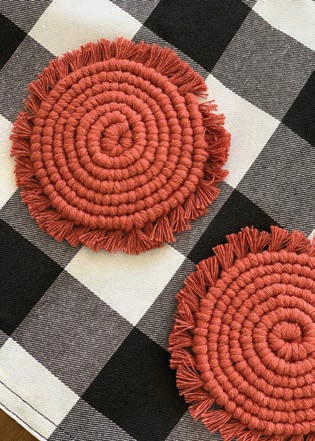Rest your coffee mug on a macrame coaster, handmade with all-natural cotton cord.