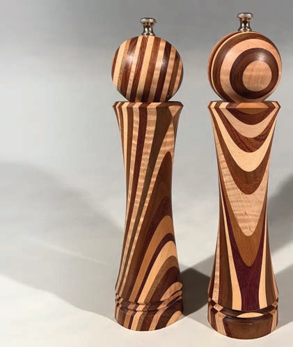 Extract maximum flavor with salt and pepper grinders by Donald Briere. The set is made with laminated cherry, maple, mahogany, purple heart and walnut.