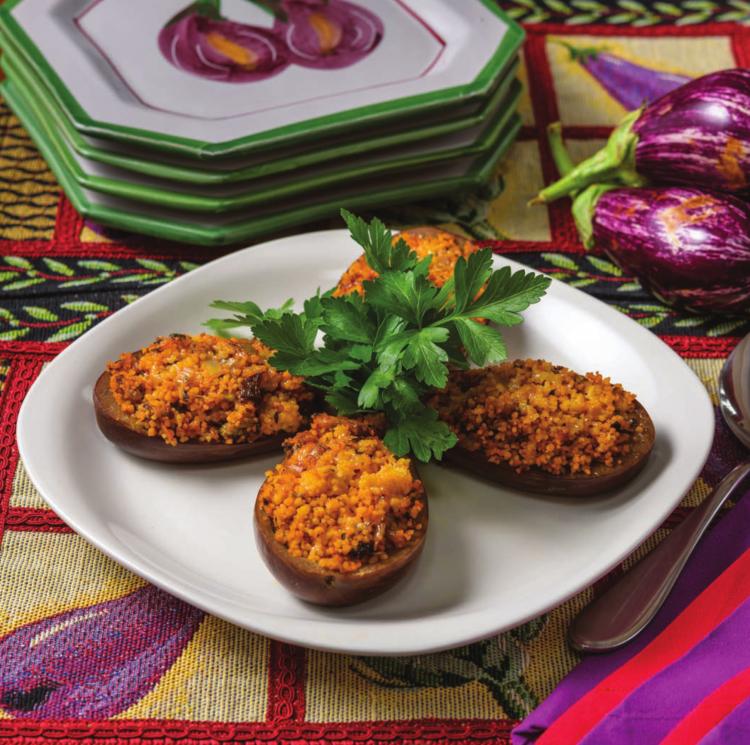 Couscous (tiny semolina pasta) is a typical Arab dish, imported into the food culture of southern Mediterranean countries more than a thousand years ago. Traditionally, Arab couscous is made with meat and vegetables. But there are many other ways to prepare couscous. This recipe uses eggplant—another food with origins in the Middle East. The eggplant shells become the “casserole dish” for this tasty entrée.