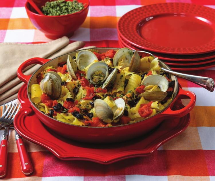 How about pizza pasta? This fun-to-make rigatoni and clam dish has pizza components—without the crust and cheese. This dish is easy to put together, and it can be baked in a pizza pan, on a rimmed baking sheet, in a cast-iron skillet or in a casserole dish. Some advice about clams: cooking them over low heat will prevent them from becoming tough.
