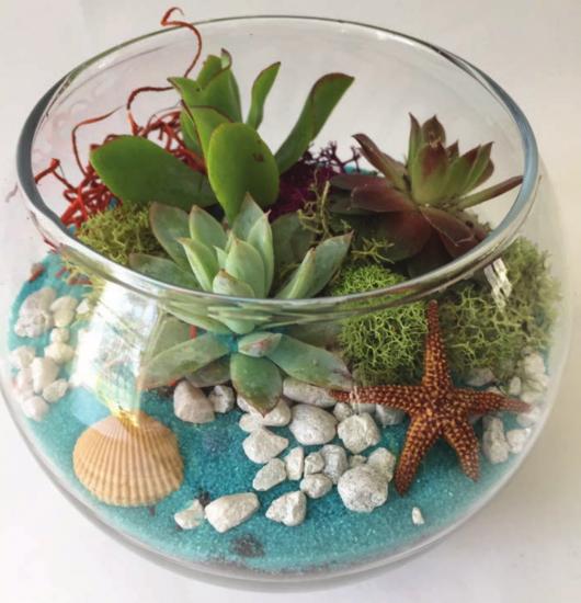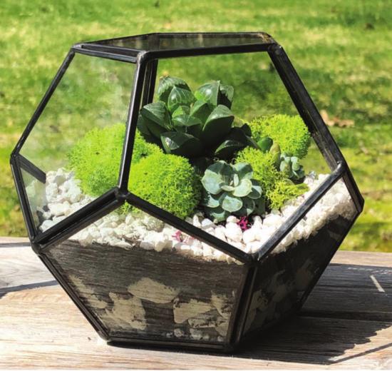 If you’re looking instead for an open terrarium or dish garden, perfect for desert plants—such as cacti and succulents—Cindy Mauchi, of Love Green Terrariums in Lee, offers some beautiful examples. “When we started, we also had tropical-plant terrariums, but currently, we only make succulent and air plant terrariums,” she says. “Open terrariums are ideal for succulents, letting the soil dry quickly— which is perfect for succulents to breathe and grow,” Mauchi says. “They don’t require a moist environment, which is what closed terrariums do.”