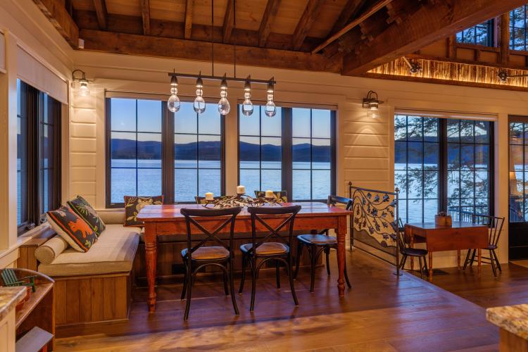 The interior has a natural feel that reflects the breathtaking lakeside surroundings. Iron, wood and glass are featured throughout, yet the space never loses a sense of comfort.
