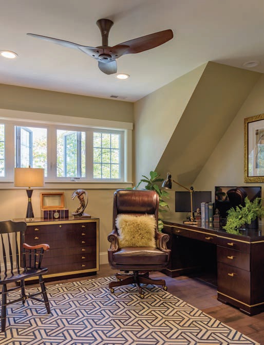 The second-floor rooms include an office designed primarily for Martin. Here, the carpet—with its bold Y-shaped design by Mitchell Gold—captures attention and grounds the room. But there’s visual interest overhead, too: a handcrafted, walnut ceiling fan.