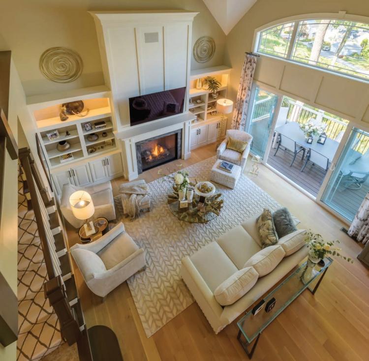 Steps away, the family room—with its soaring, angular ceiling and view of the lake—would in many people’s minds count as another “wow spot.” In choosing furnishings for this room, “the lake vibe was important to keep in mind,” Shakra says. She and the homeowners chose to blend the modern with the classic as well as incorporate multiple textures while still honoring a New England style. “Over the years, [this style] has been transforming from very traditional to a more clean, transitional look,” Shakra says.