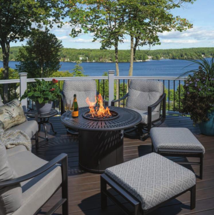 Long, sheer window treatments with a leaf pattern and pale-gray border by J&R Langley of Manchester add warmth to the room without detracting from the star attraction: the view of the lake. Beyond the room’s expansive windows and slider doors, ample seating beckons on the home’s deck.