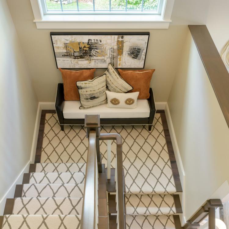 Heading upstairs, the carpeting’s loose latticework pattern leads to a custom ottoman accented with white piping and pillows perched on top—one of which features a whimsical eye design by Jonathan Adler.