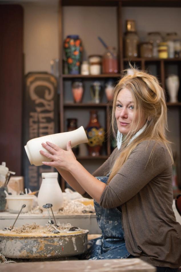 Potter Stephanie Young has always been drawn to art and the process of making in general. Owner of Calmwater Designs, Young found her passion in high school, where she delighted in art classes and would tuck herself away to work on projects. Art school, she says, was a “lawless” time—there she had access to the studio and clay at all hours of the day. “I snuck in, and could work in solitude after a waitressing shift or early in the morning before my comrades in creativity woke up to share the space,” Young says.