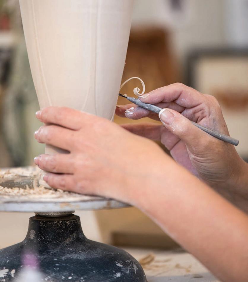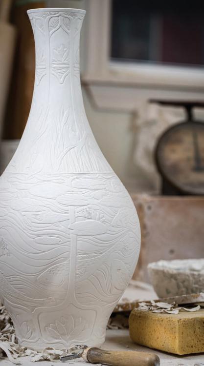 That is the entirety of the creative process, but within that, I love the details of the making. Creating the vase on the wheel is a sensory activity that demands your full attention—a dance of sorts. Carving allows me to flow creatively, creating geometric harmonies I find soothing. Within them, I weave natural subjects that soothe just the same. I love the solitude of this creative time. I love the glazing, finishing the work, as it will be presented to the world and meditating with brushstrokes.