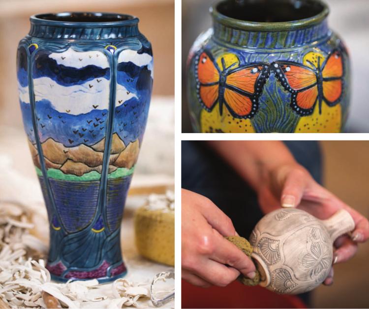 The more you look at Young’s intricate work, the more details you’ll notice. She finds inspiration in nature, she says, from “bugs and critters” and swans swimming in a reservoir to blooming morning glories and tomato plants growing in her own backyard. Bottom right: Young carves her designs before applying glaze.