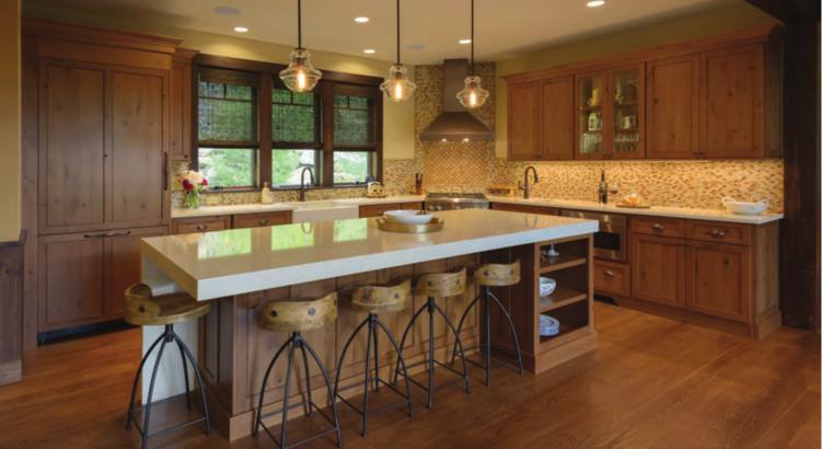 Above and left: The goal, says Pamela Greene, a certified master kitchen and bath designer, was to give the home “a fresh edge on the rustic aesthetic.” This is exemplified in the kitchen and dining area, with its sleek countertops and tasteful furniture paired with rustic alder cabinets.