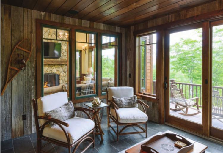 “The master bedroom has a beautiful view of the mountains and is my own little retreat,” she says. “The three-season porch is a great place to read and have a glass of wine. It’s really become a four-season porch by turning on the little gas stove that heats the whole room. During the pandemic, I turned it into my part-time yoga room as well.”