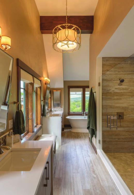 Opposite page and top: The master bath features outstanding views for ultimate relaxation while soaking in the tub after a long day of skiing.