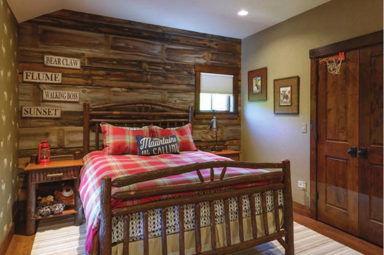 “Since this couple is young, their taste and selections were certainly rustic but more on the contemporary side,” she says. “My goal was to give them a fresh edge on the rustic aesthetic. This can be seen in the kitchen, with the sleek quartz countertops, laminated edge and square waterfall edge counterbalanced with the rustic alder cabinets.”