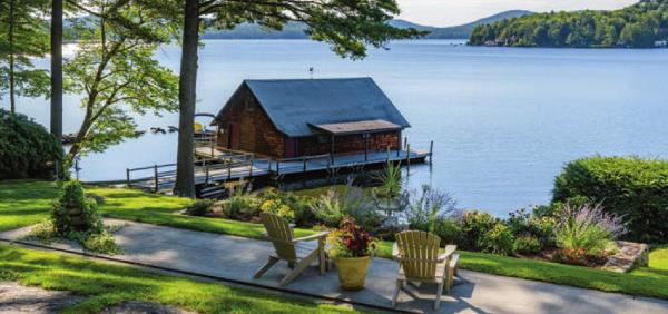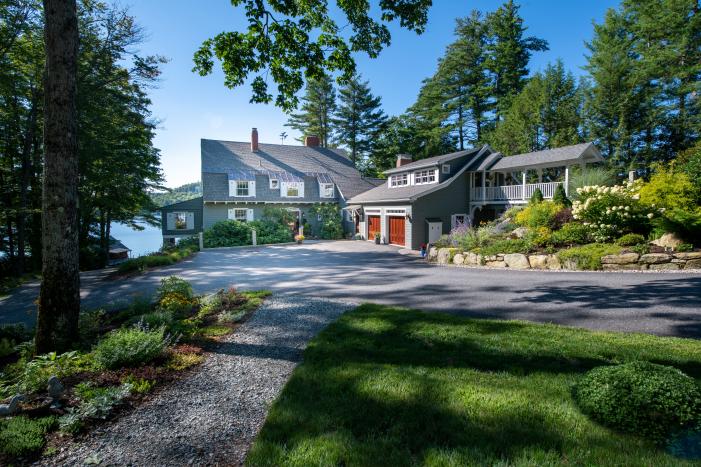 The house—which sits atop an emerald lawn that slopes down to the waterfront of Sunapee Harbor, not far from Dewey Beach—was previously a sage green. It was given an entirely new look thanks to a custom color—Coffin Blue. It serves as an appropriate touch to an ongoing journey to a family’s past.