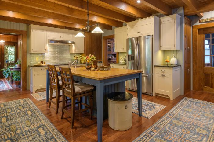 Booth provided an island and drawers, and Stocker built a custom top from white oak. There were no beams in the old kitchen ceiling, yet Stocker was able to add some and tie them with those in the adjoining rooms, maintaining continuity and giving the impression the new kitchen beams were original.