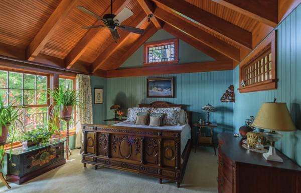 A bed for the master bedroom was located at Prospect Hill Antiques in Sunapee. “On one of our trips, Deb spotted a stunning antique bed. She loved it, but it had to be transformed into a king size,” Ballin says. “A local craftsman, Max Brown, did an amazing job replicating exactly all those carvings.”